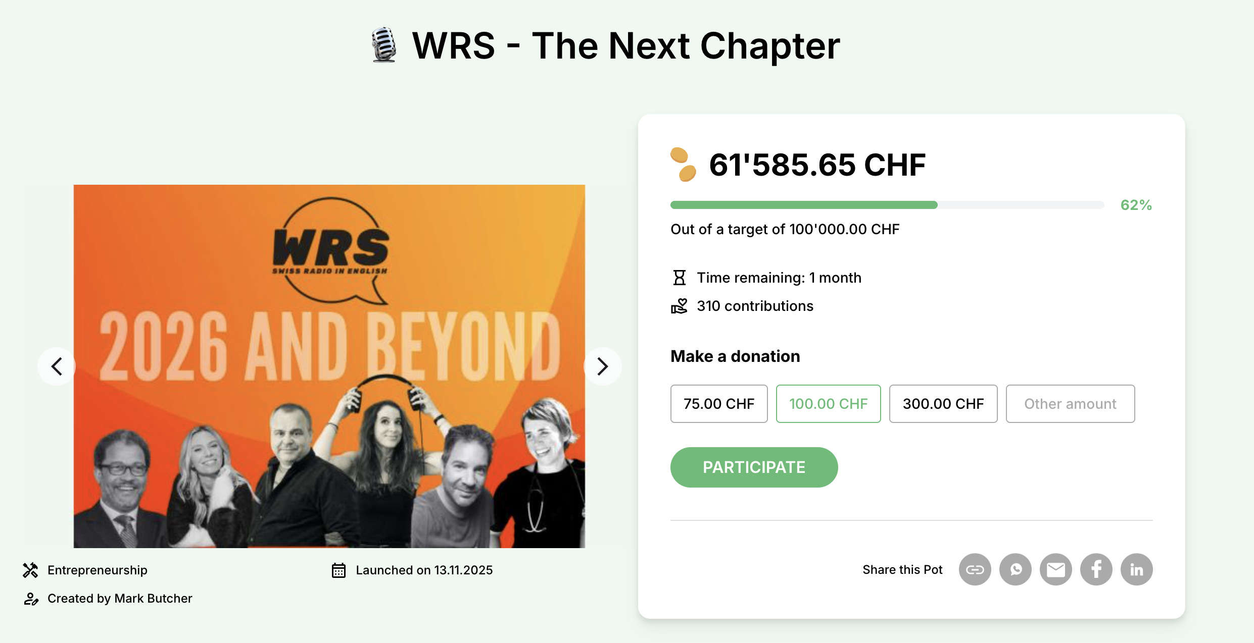 💳 CHF 25’000+ Join WRS history - leave your mark on English radio in Switzerland.